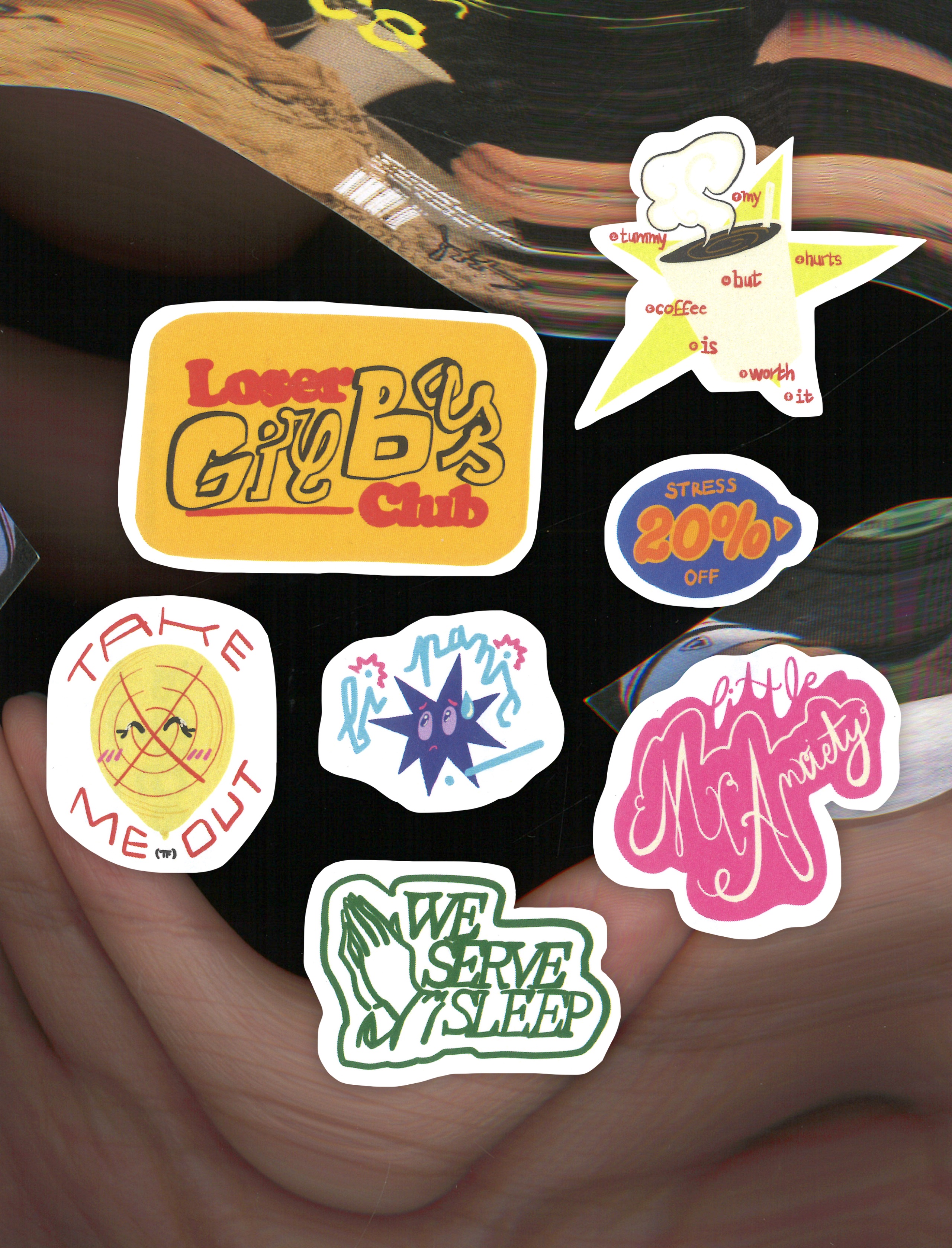 Pack de stickers dessinés avec max de panique pour (dé)stresser : y'a de tout dedans, du manque de sommeil, de la cafféine et un peu beaucoup de confusion. Parfaits en période d'examens, de concours ou encore un peu plus pour tous les jours.